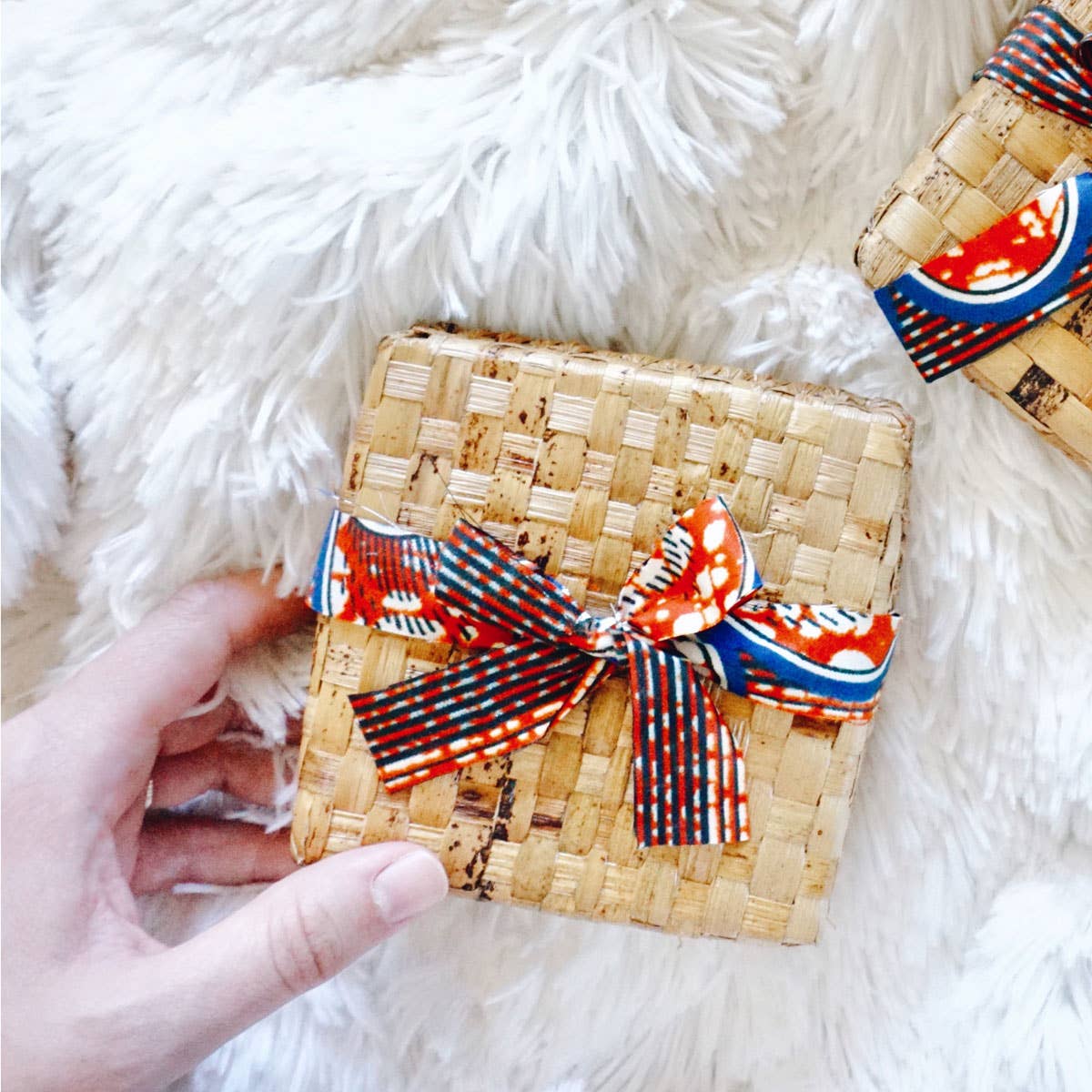 Caja de regalo tejida con hojas de plátano y forrada con retales de tela de costureras locales.