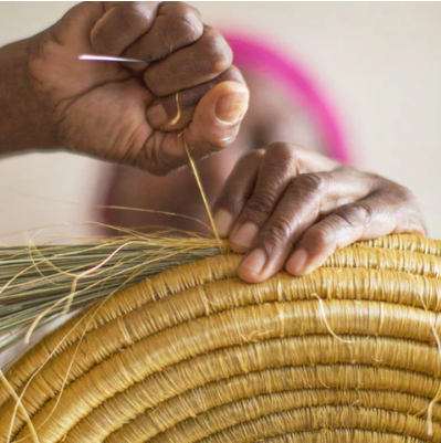Made from strands of sisal wrapped around bunches of sweetgrass and locally sourced fibers
